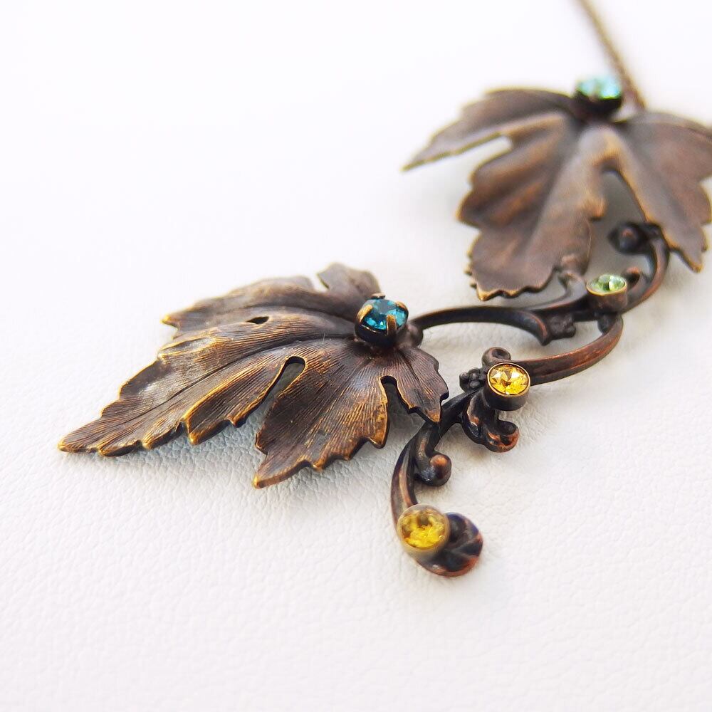 この[ garden ]は、古びて化石化したような植物も、生命を宿し輝きを取り戻すことが出来ると願う気持ちで作りました。ヴィンテージパーツはメッキをせずに、真鍮や丹銅、銀(ロウ付け部分)などの金属素材そのままの風合いを古美仕上げしたことにより、有機的な作品に仕上がっています。