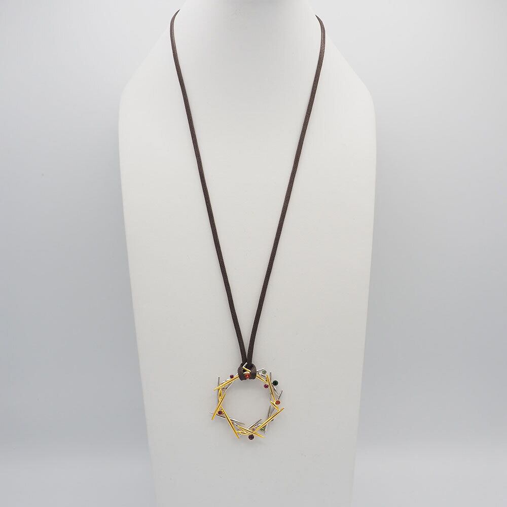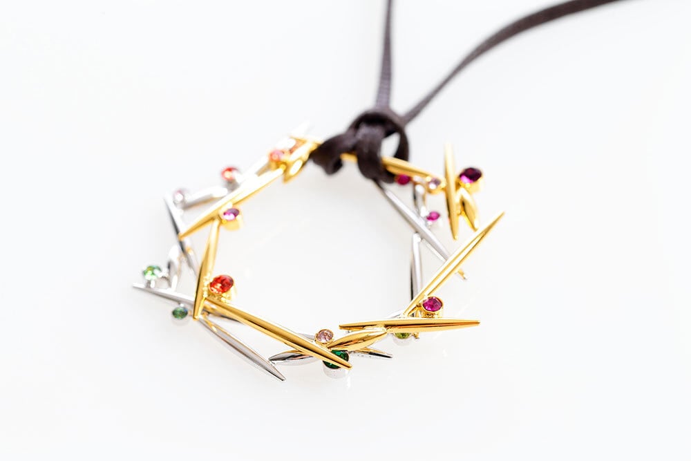 ゴールドカラーとシルバーカラーのリングを紐でまとめただけのデザインが、複雑な陰影をつくりあげています。