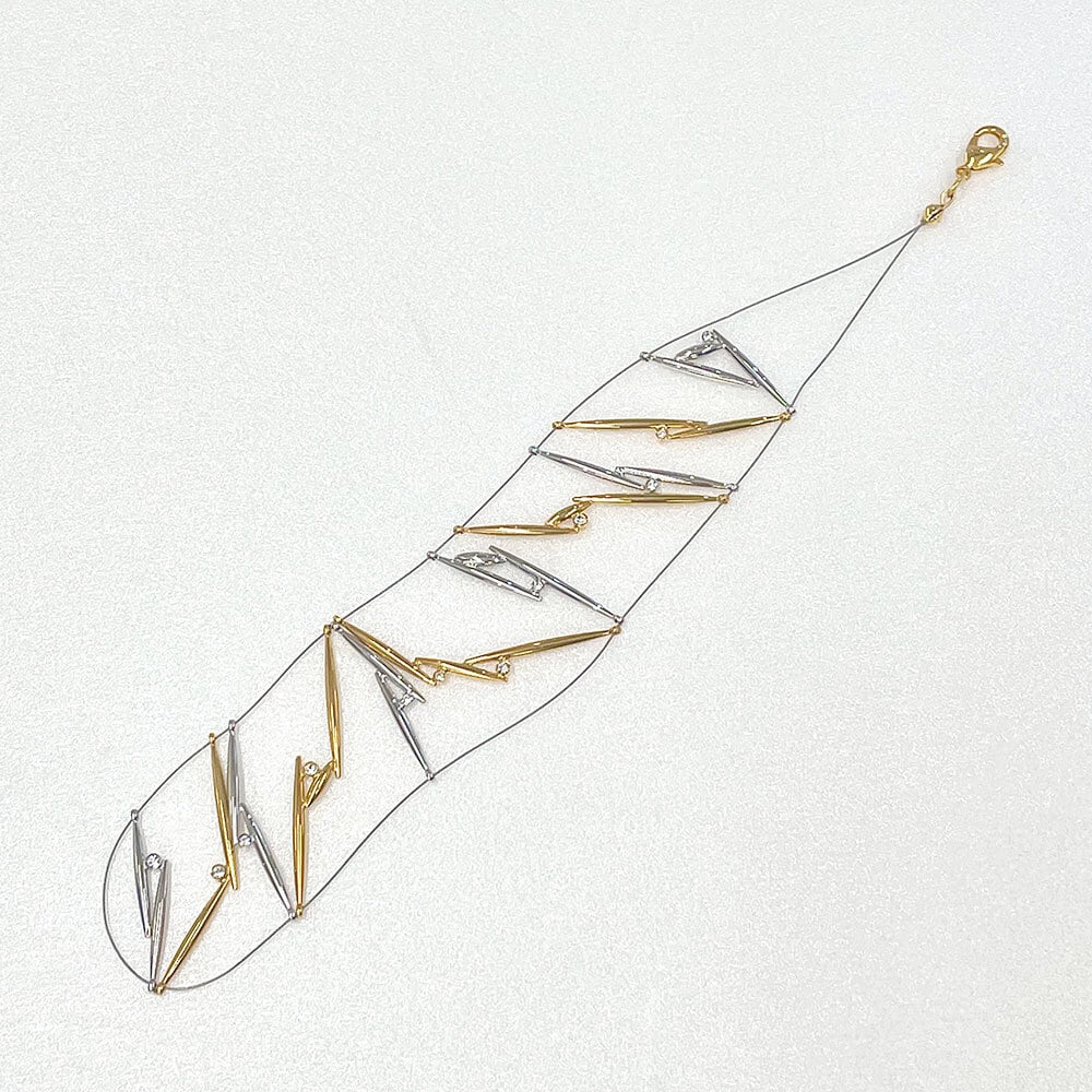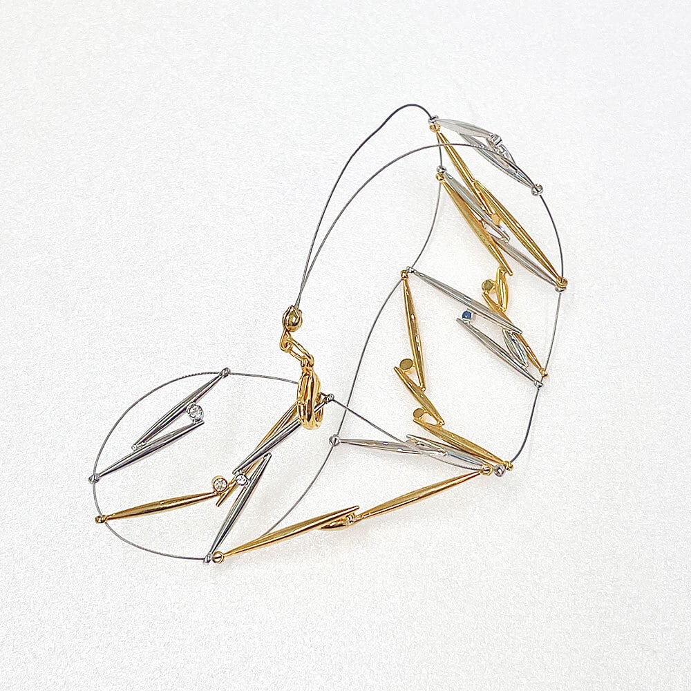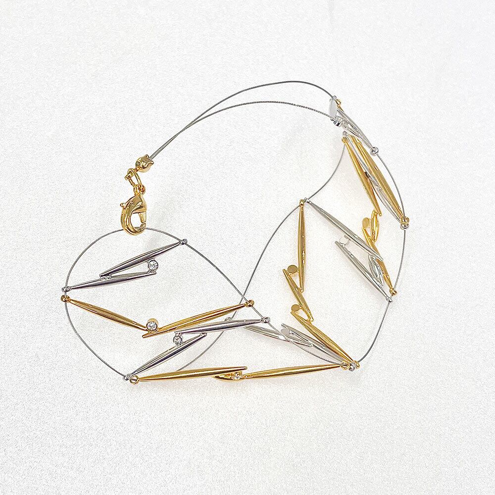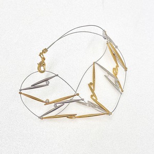 人体の神経細胞[neuron]を抽象化したデザイン。軽やかでアシンメトリーなデザインです。2本のワイヤーにつながれた神経伝達パーツは自由に動かすことができ、着用するごとにフォルムを変化させることができます。また、クラスプはワイヤーに取り付けるだけでなく、パーツに取り付けることができるので、短くつけることも可能です。
